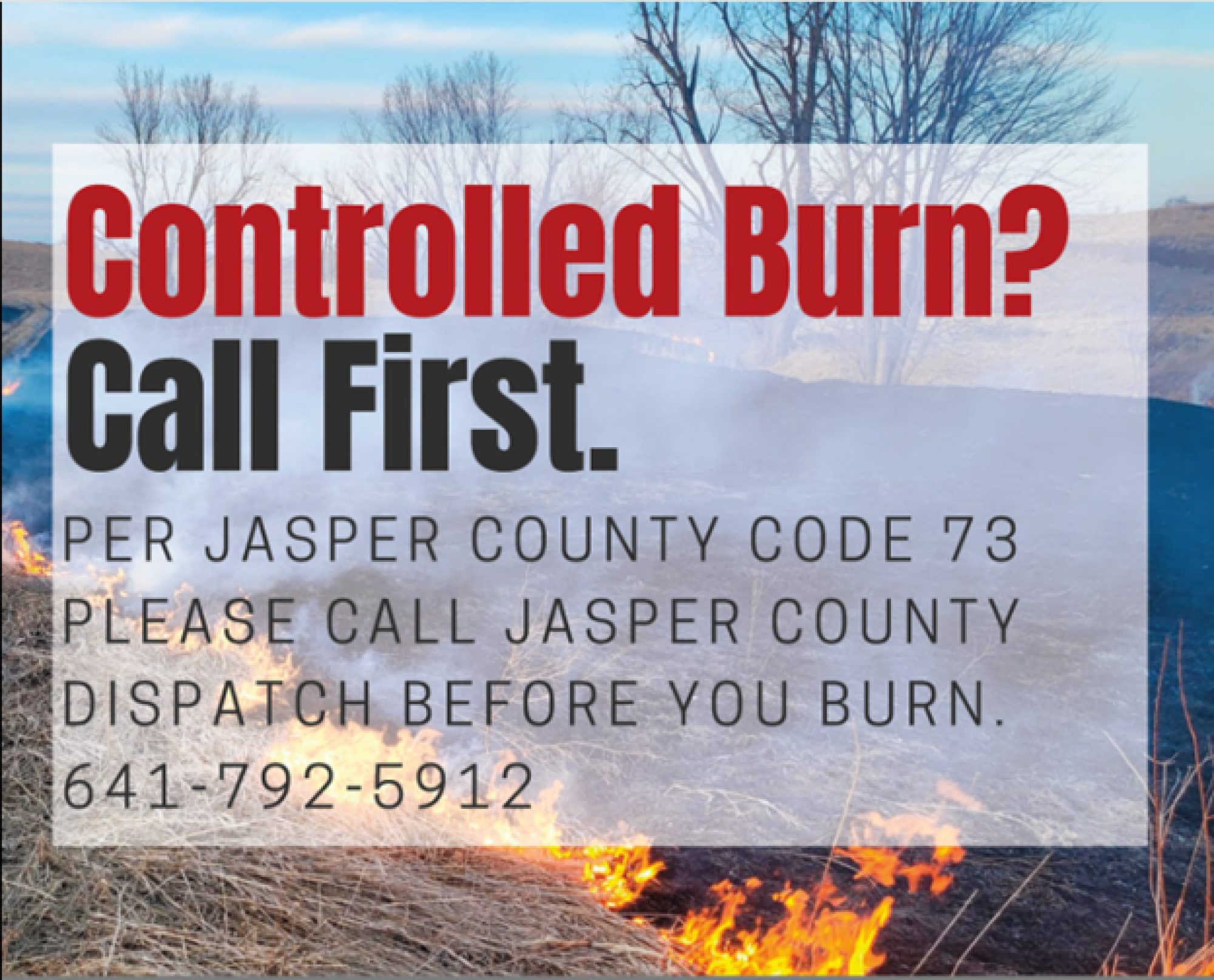 Prior to any structure fires, controlled burns or prescribed burns the individual(s) overseeing the burn shall provide notice to a Jasper County Dispatch Operator by calling the non-emergency phone number for Jasper County Dispatch and providing all required burn information.